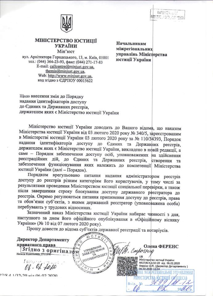 Лист Міністерства юстиції України від 06.02.2020 №27/8.4.1/32-20 про внесення змін до Порядку надання ідентифікаторів доступу до Єдиних та Державних реєстрів, держателем яких є Міністерство юстиції України