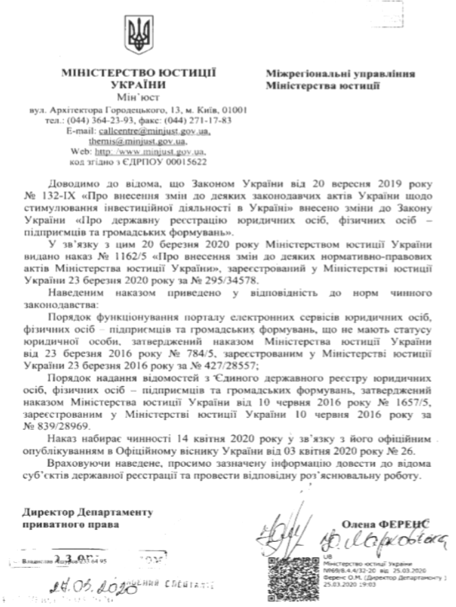 Лист Міністерства юстиції України від 25.03.2020 №69/8.4.4/32-20 щодо наказу від 20.03.2020 №1162/5