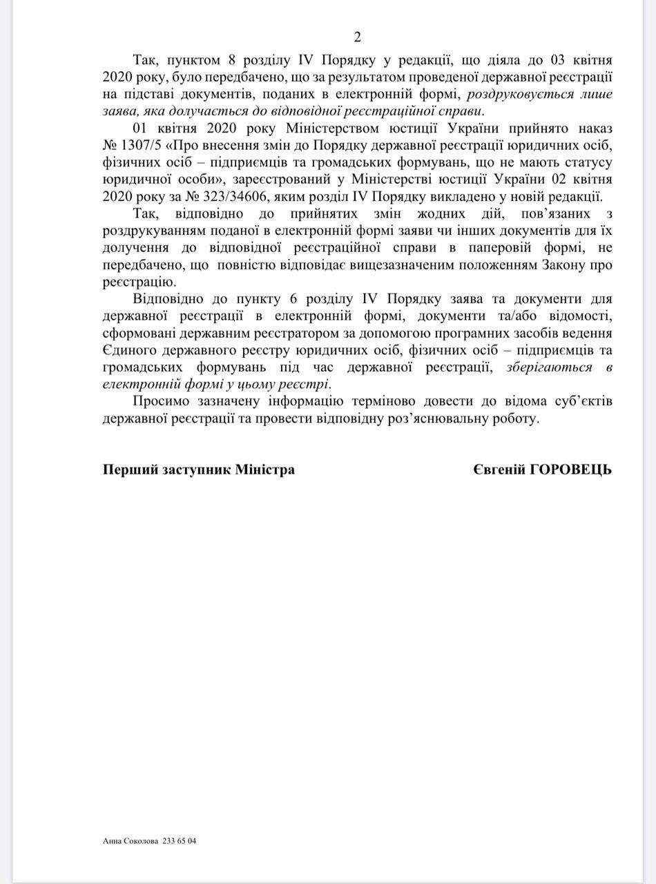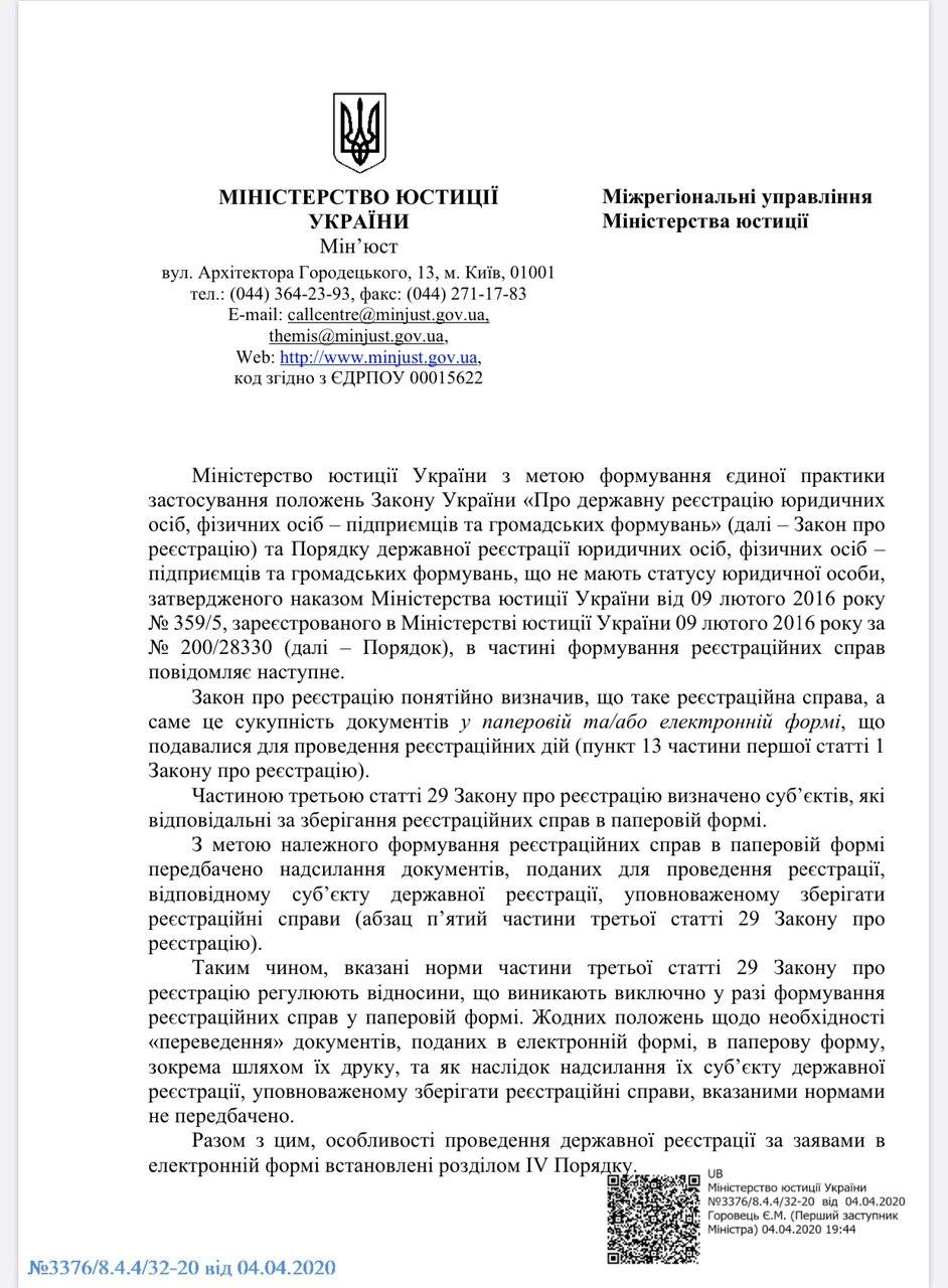 Лист Міністерства юстиції України від 04.04.2020 №3376/8.4.4/32-20 щодо документів, поданих в електронній формі