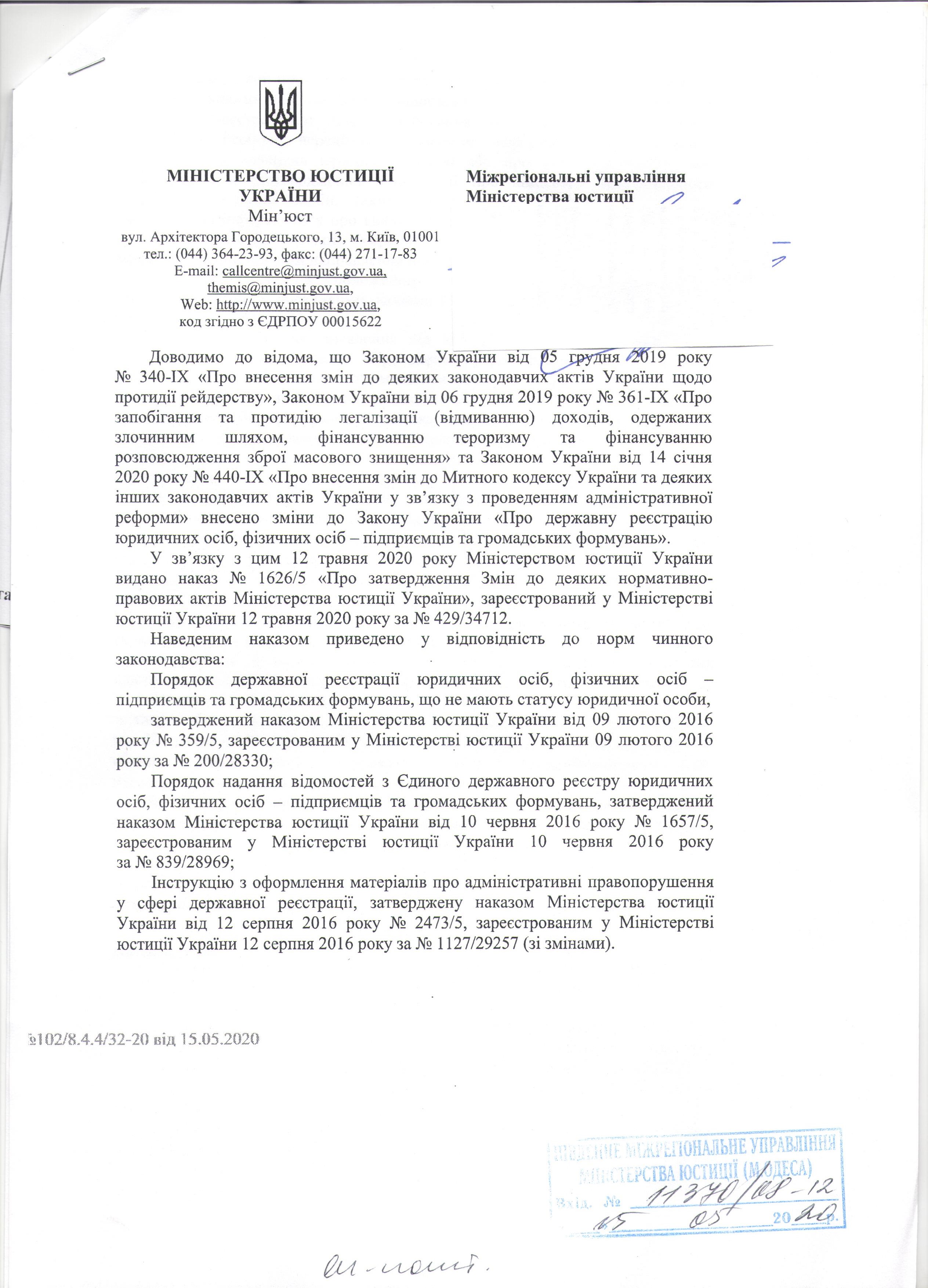 Лист Міністерства юстиції України від 15.05.2020 №102/8.4.4/32-20 щодо наказу Міністерства юстиції України "Про затвердження Змін до деяких нормативно-правових актів Міністерства юстиції України" від 12.05.2020 №1626/5