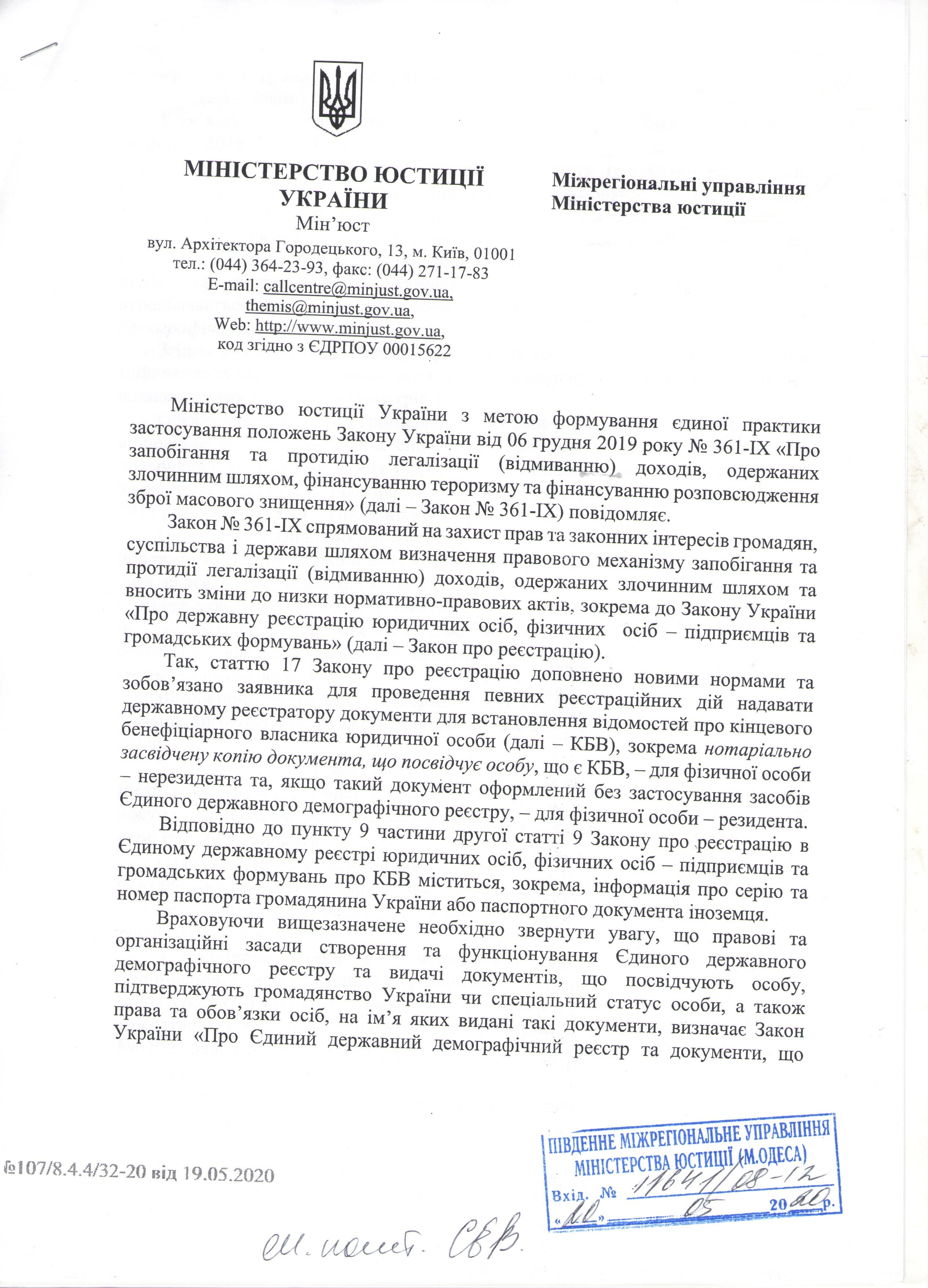 Лист Міністерства юстиції України від 19.05.2020 №107/8.4.4/32-20 щодо деяких питань, пов’язаних з оформленням документів, які подаються для встановлення відомостей про кінцевого бенефіціарного власника юридичної особи