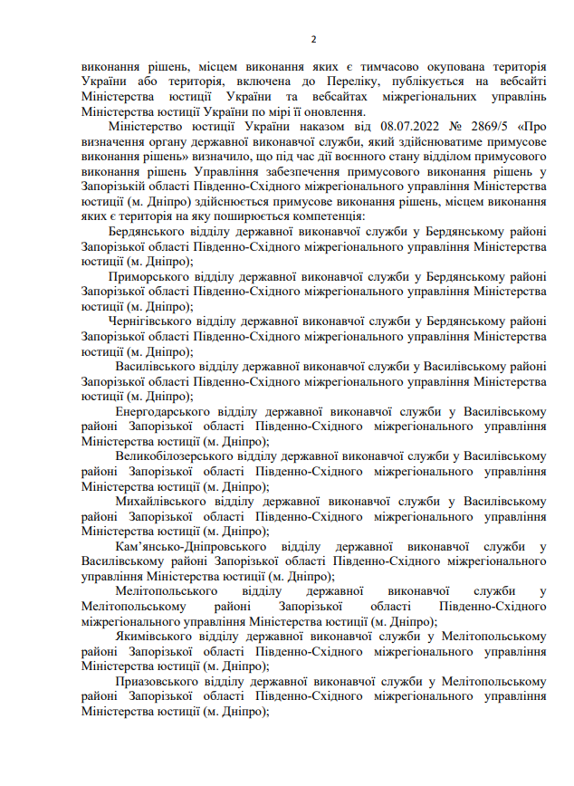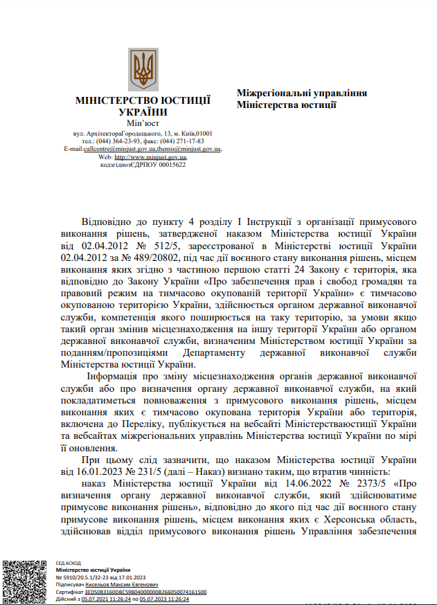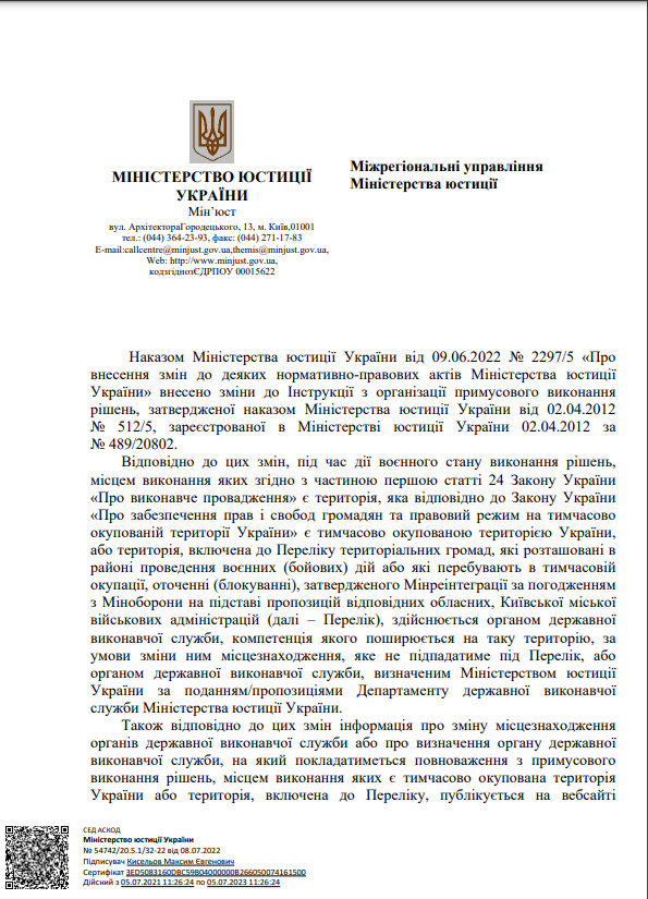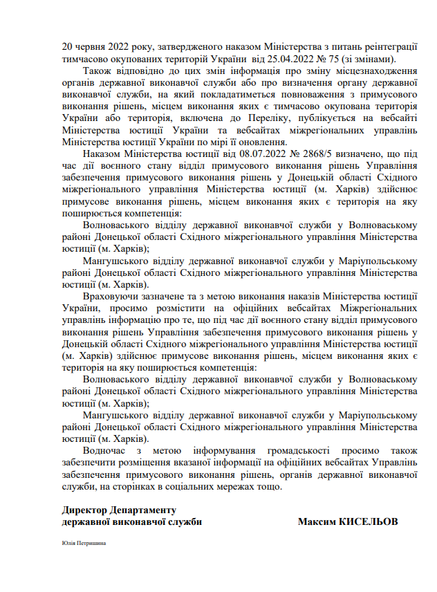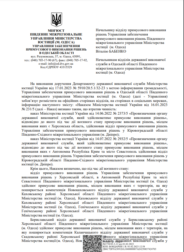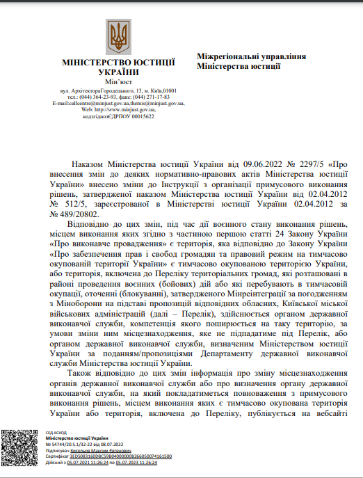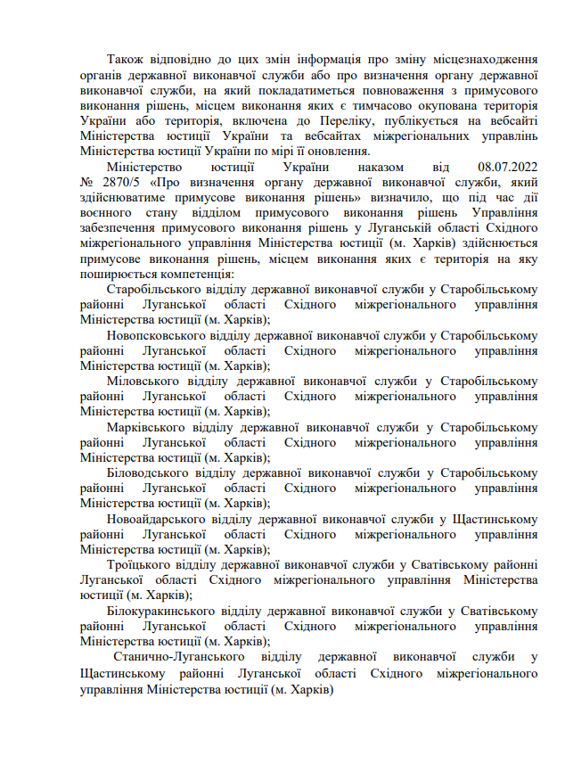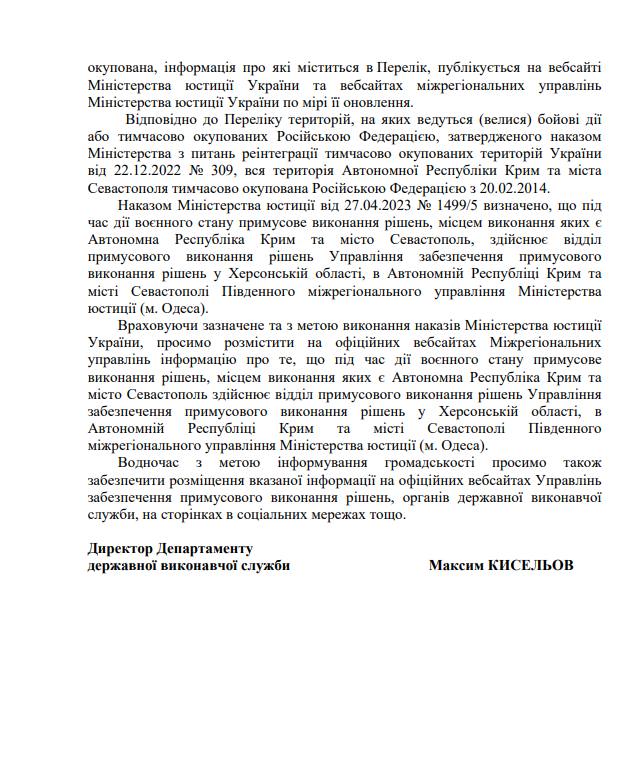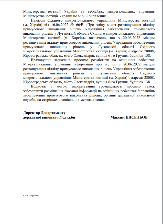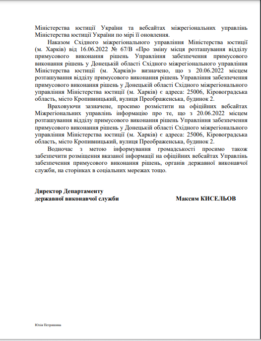 На виконання листа директора Департаменту державної виконавчої служби Міністерства юстиції України Кисельова М.Є. № 57225/20.5.1/32-22 від 14.07.2022 щодо розміщення інформації про те, що під час дії воєнного стану примусове виконання рішень, місцем виконання яких є Автономна Республіка Крим та місто Севастополь здійснює відділ примусового виконання рішень Управління забезпечення примусового виконання рішень у Кіровоградській області Південно-Східного міжрегіонального управління Міністерства юстиції (м.Дніпро)