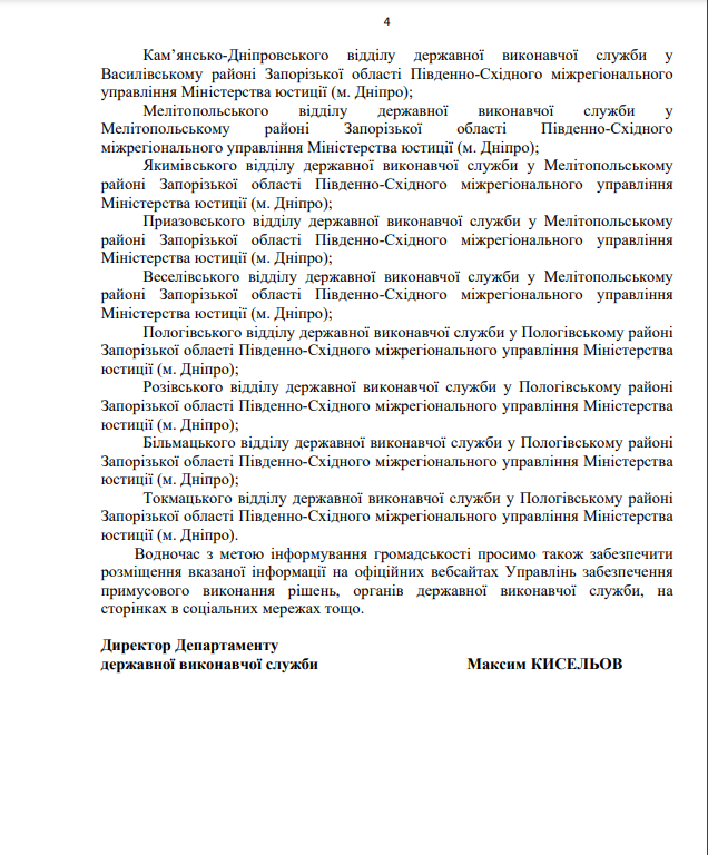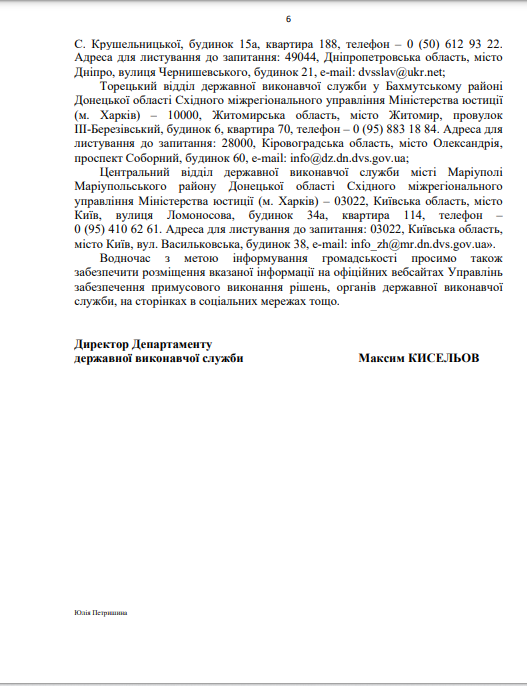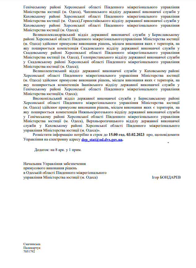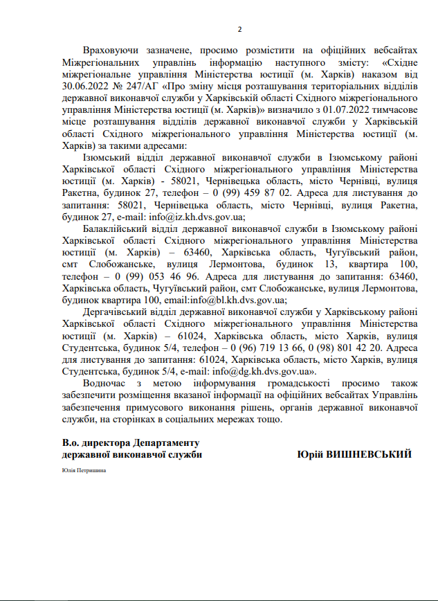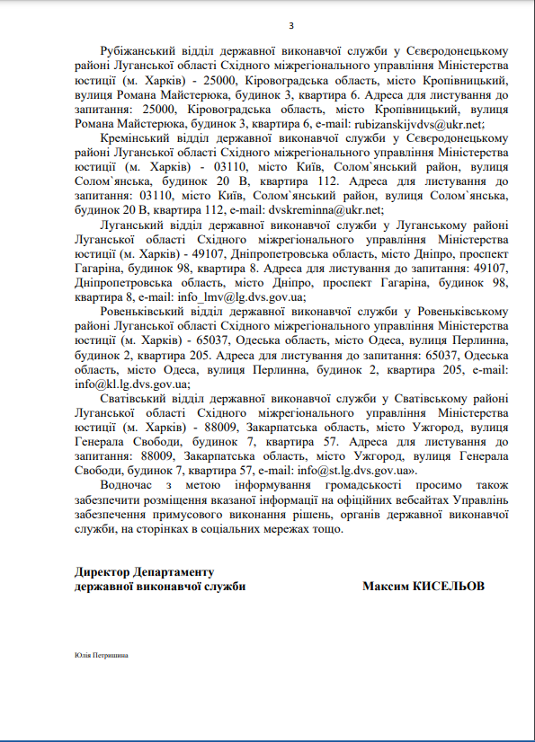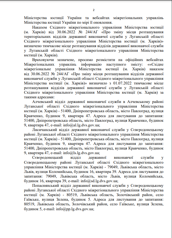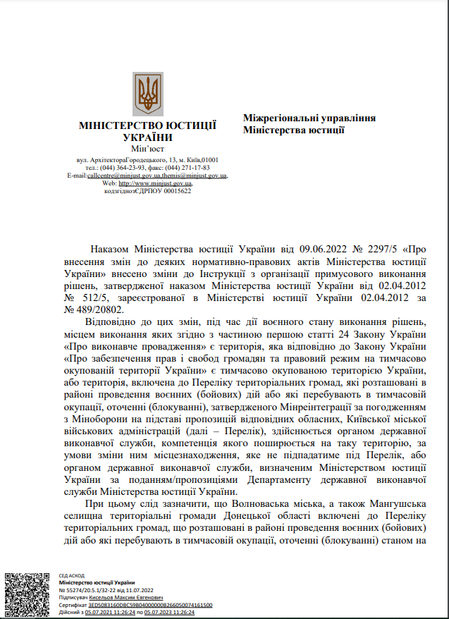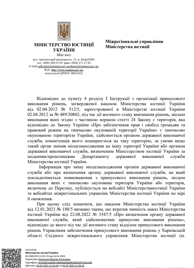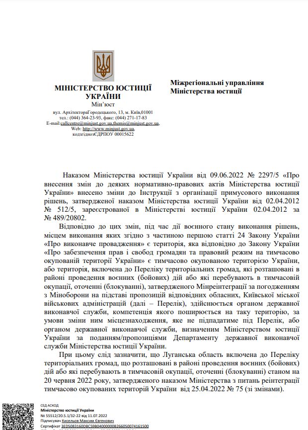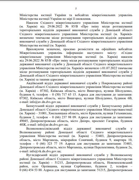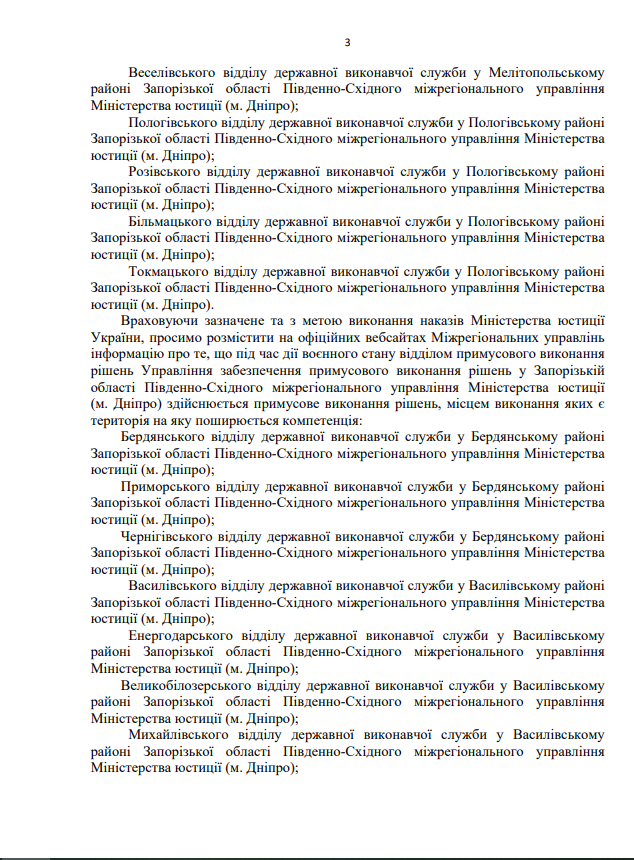 На виконання листа директора Департаменту державної виконавчої служби Міністерства юстиції України Кисельова М.Є. № 57225/20.5.1/32-22 від 14.07.2022 щодо розміщення інформації про те, що під час дії воєнного стану примусове виконання рішень, місцем виконання яких є Автономна Республіка Крим та місто Севастополь здійснює відділ примусового виконання рішень Управління забезпечення примусового виконання рішень у Кіровоградській області Південно-Східного міжрегіонального управління Міністерства юстиції (м.Дніпро)