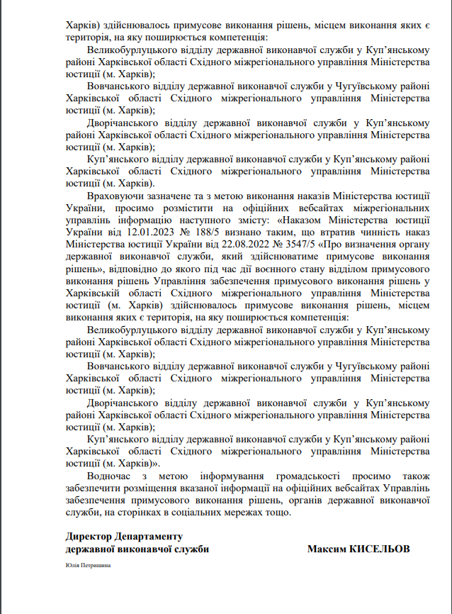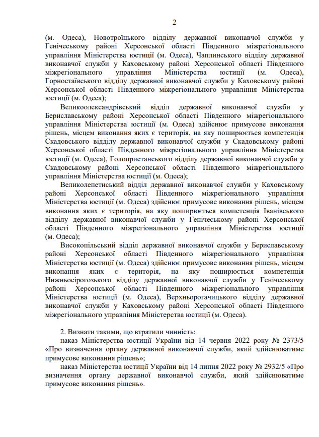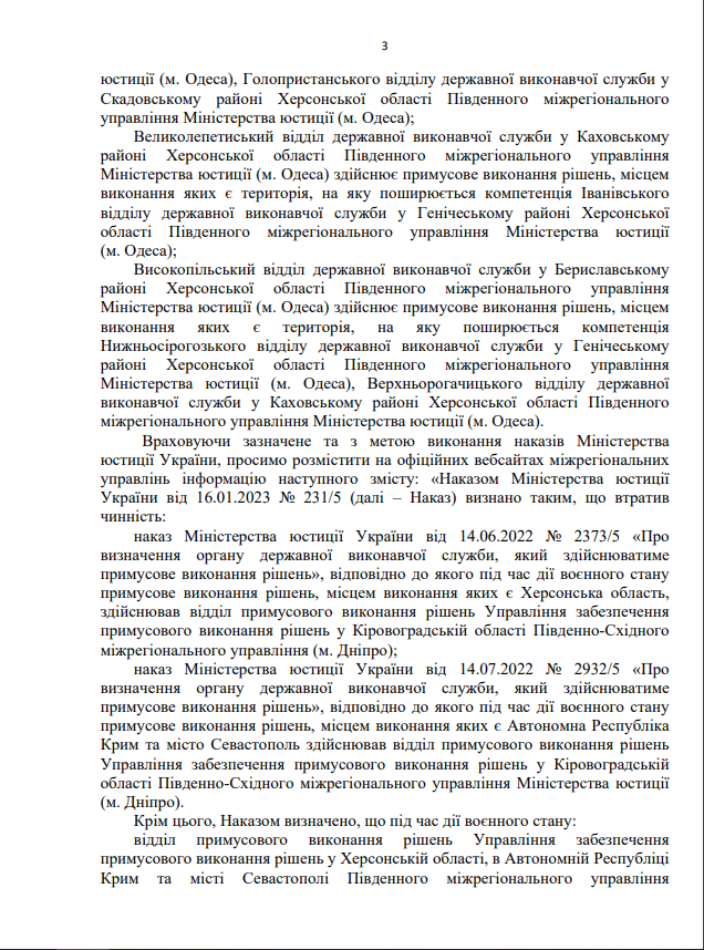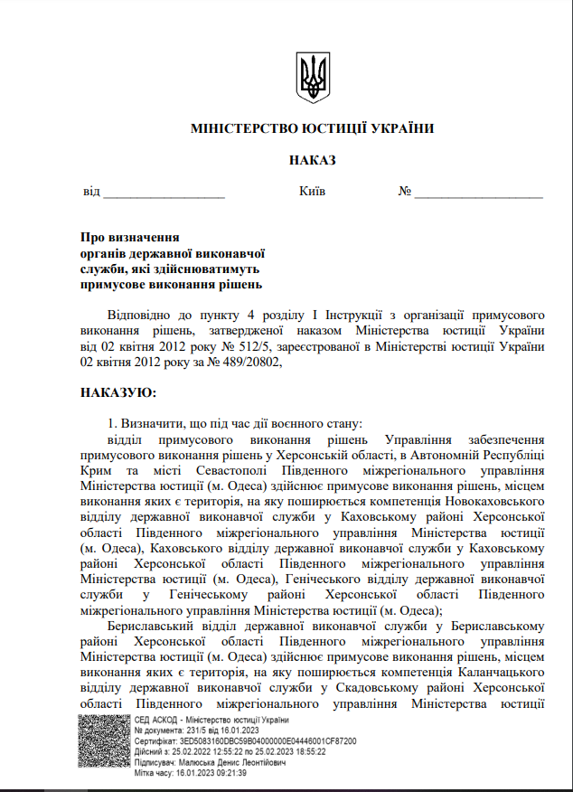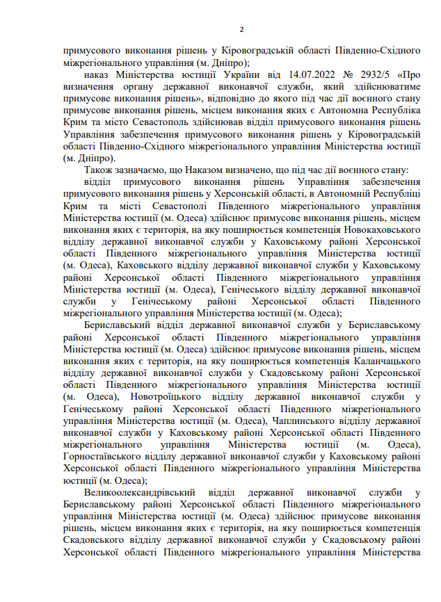 Про визначення органу державної виконавчої служби, який здійснюватиме примусове виконання рішень - Визначити, що під час дії воєнного стану примусове виконання рішень, місцем виконання яких є Херсонська область, здійснює відділ примусового виконання рішень Управління забезпечення примусового виконання рішень у Кіровоградській області Південно-Східного міжрегіонального управління (м. Дніпро).