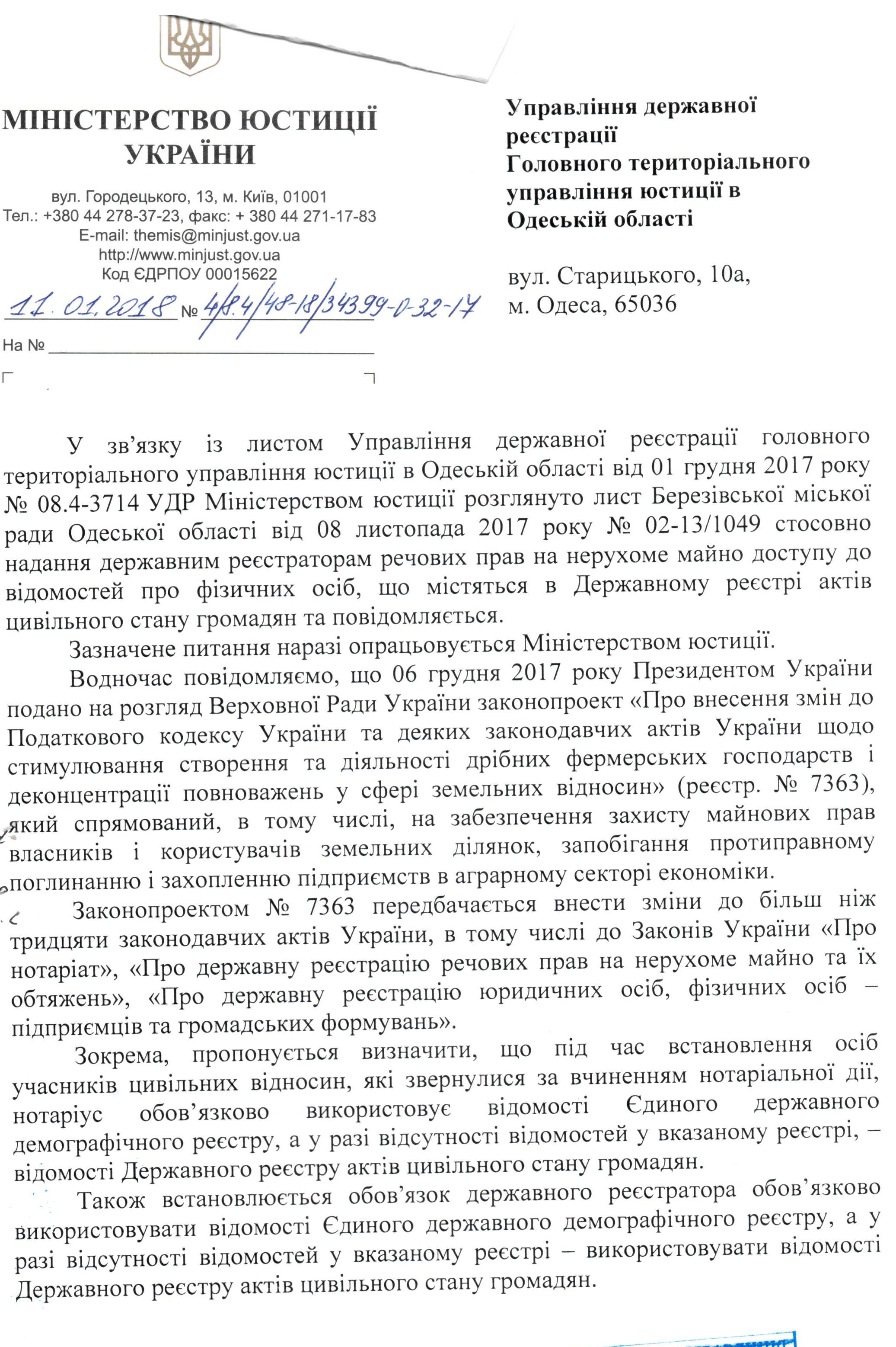 Лист Міністерства юстиції України від 11.01.2018 №4/8.4/48-18/34399-0-32-17 стосовно надання державним реєстраторам речових прав на нерухоме майно доступу до відомостей про фізичних осіб, що містяться в Державному реєстрі актів цивільного стану громадян т