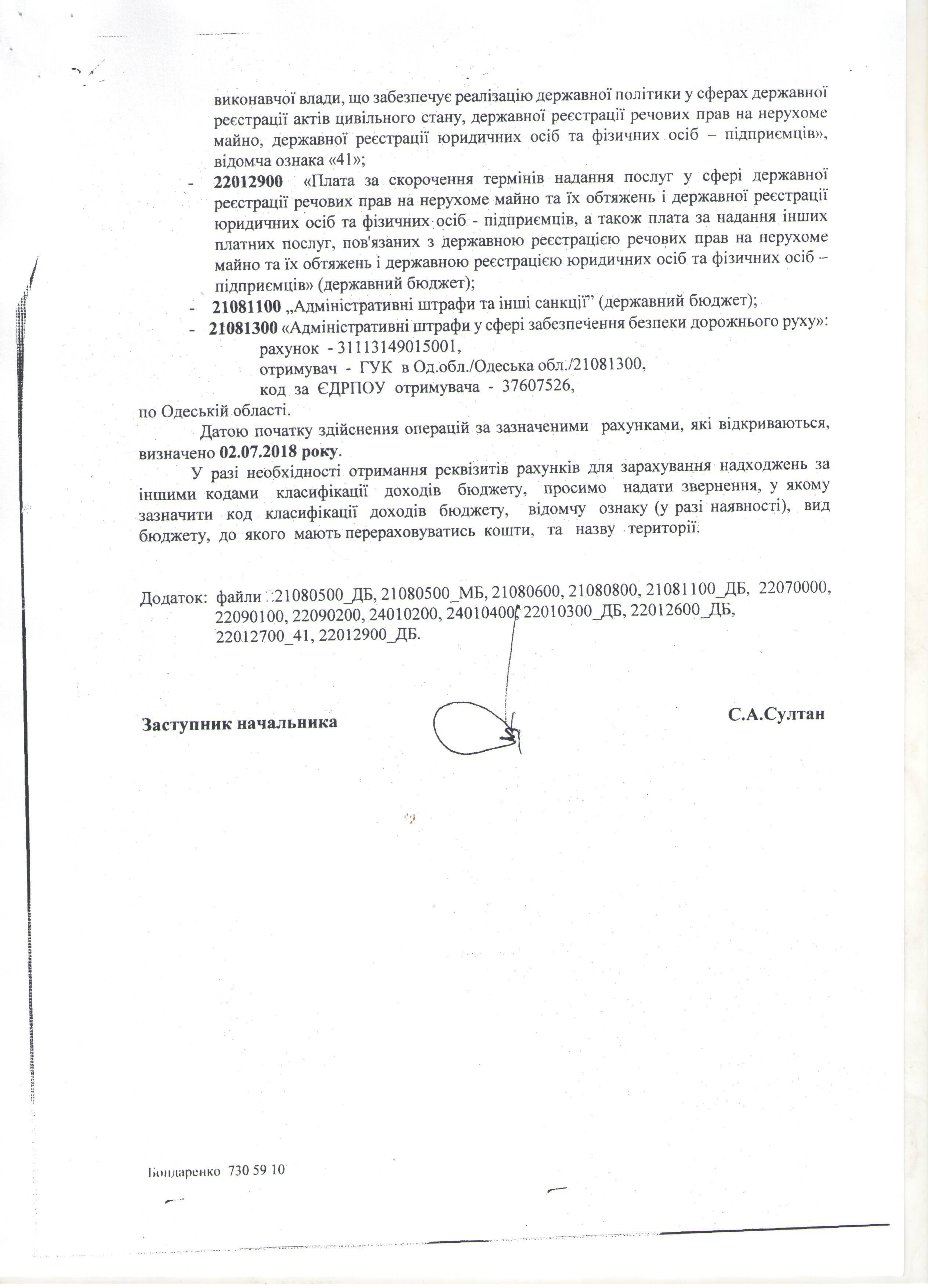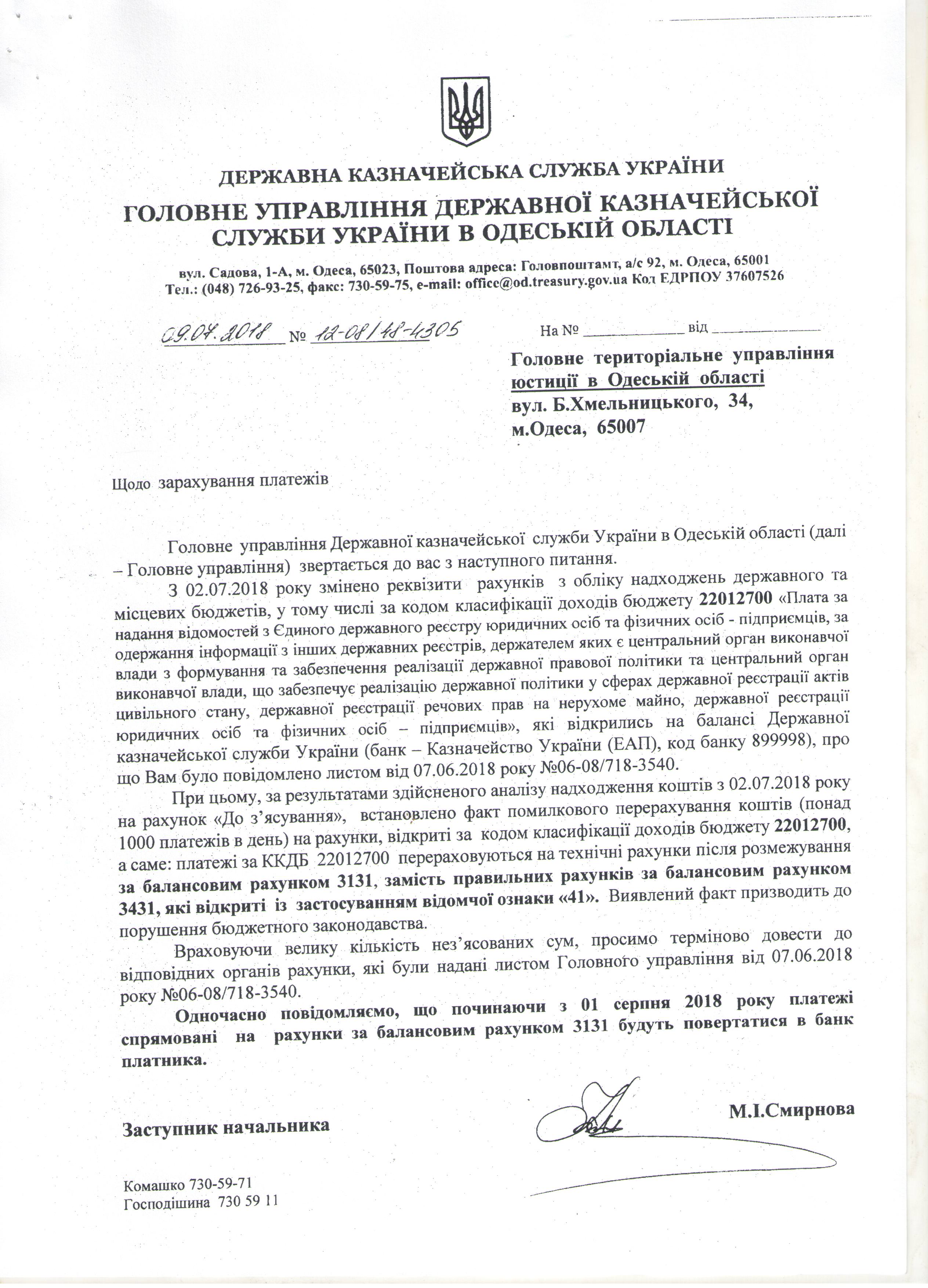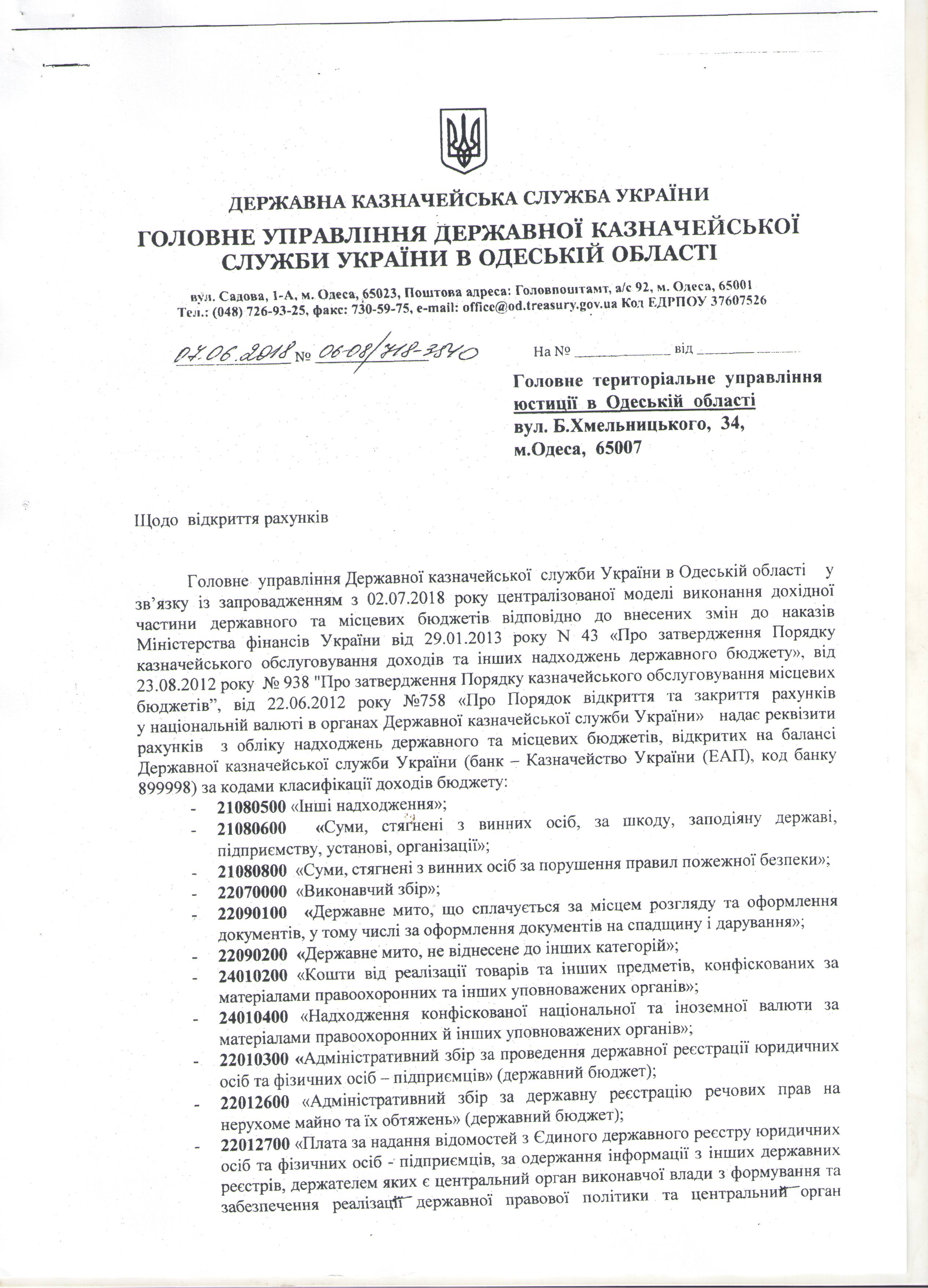 Листи Головного управління Державної казначейської служби України в Одеській області від 07.06.2018 №06-08/718-3540 щодо відкриття рахунків та від 09.07.2018 №12-08/48-4305 щодо зарахування платежів