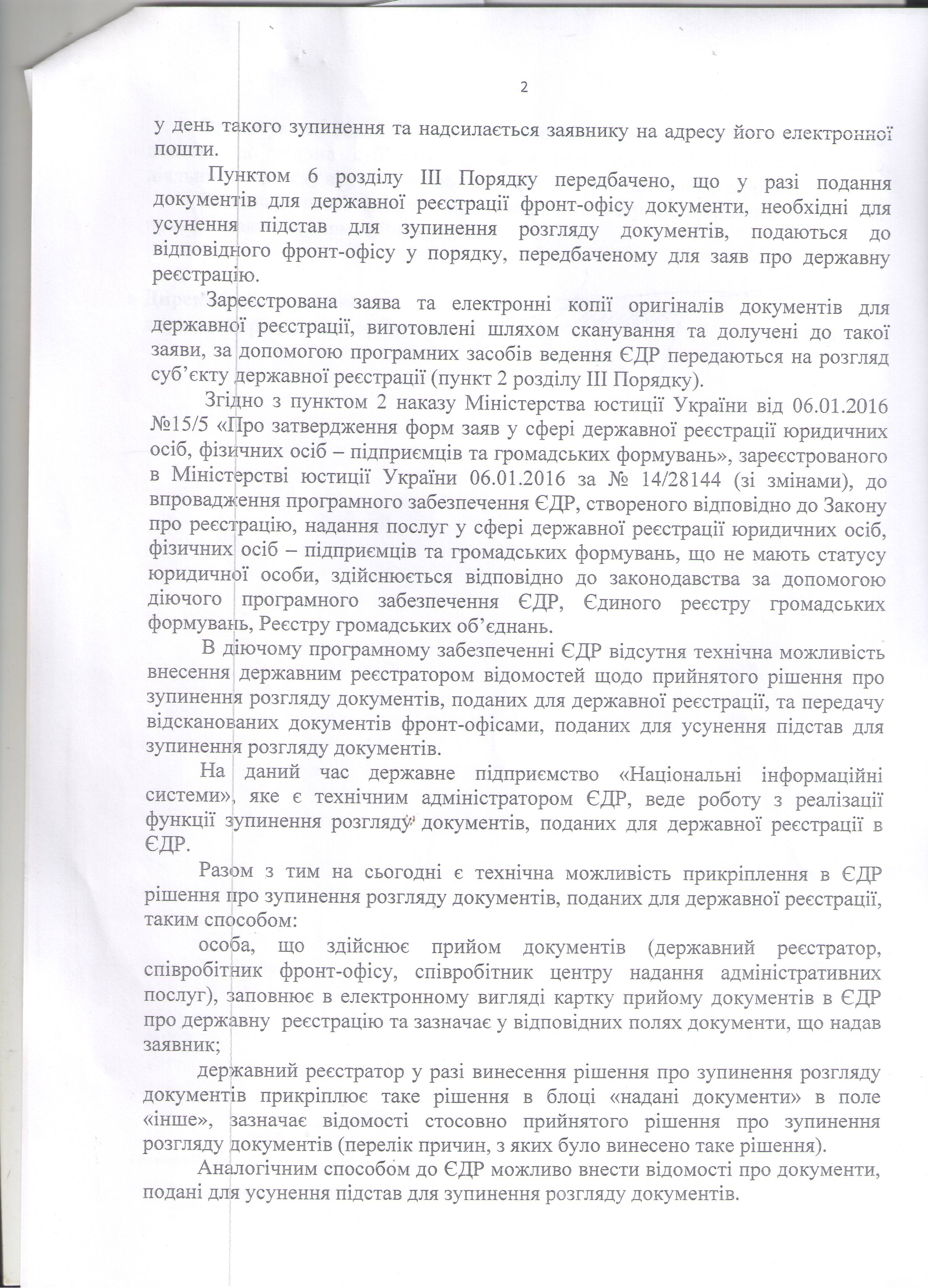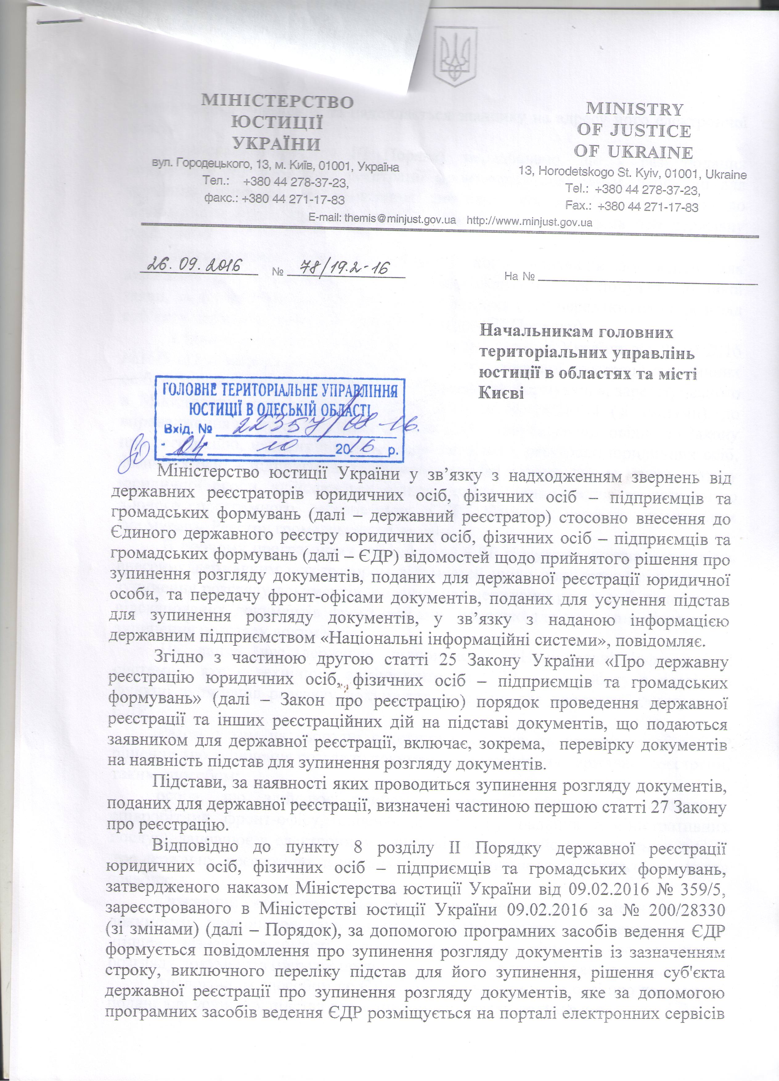 Лист Міністерства юстиції України від 26.09.2016 № 78/19.2-16 стосовно внесення до Єдиного державного реєстру юридичних осіб, фізичних осіб – підприємців та громадських формувань відомостей про зупинення розгляду документі