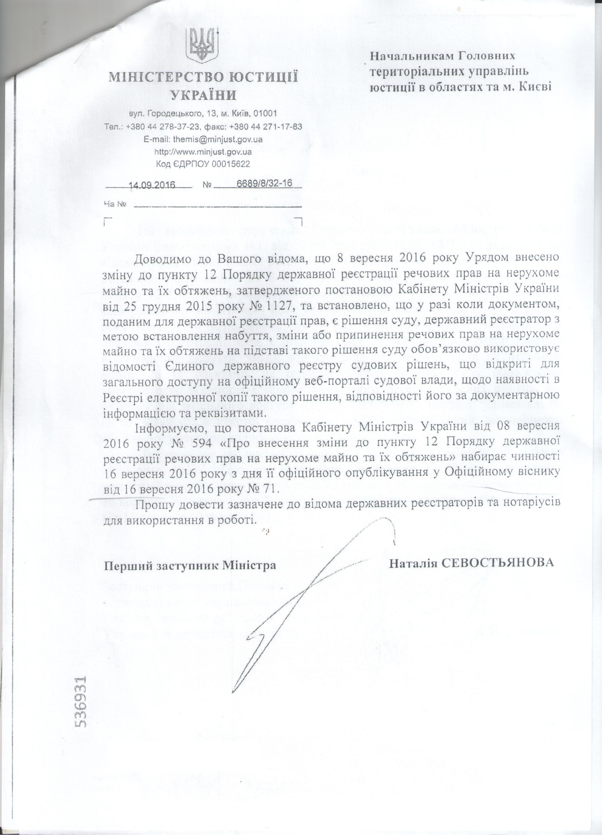Лист Міністерства юстиції України від 14.09.2016 № 6689/8/32-16 щодо набрання чинності Постанови Кабінету Міністрів України «Про внесення змін до пункту 12 Порядку державної реєстрації прав на нерухоме майно та їх обтяжень»