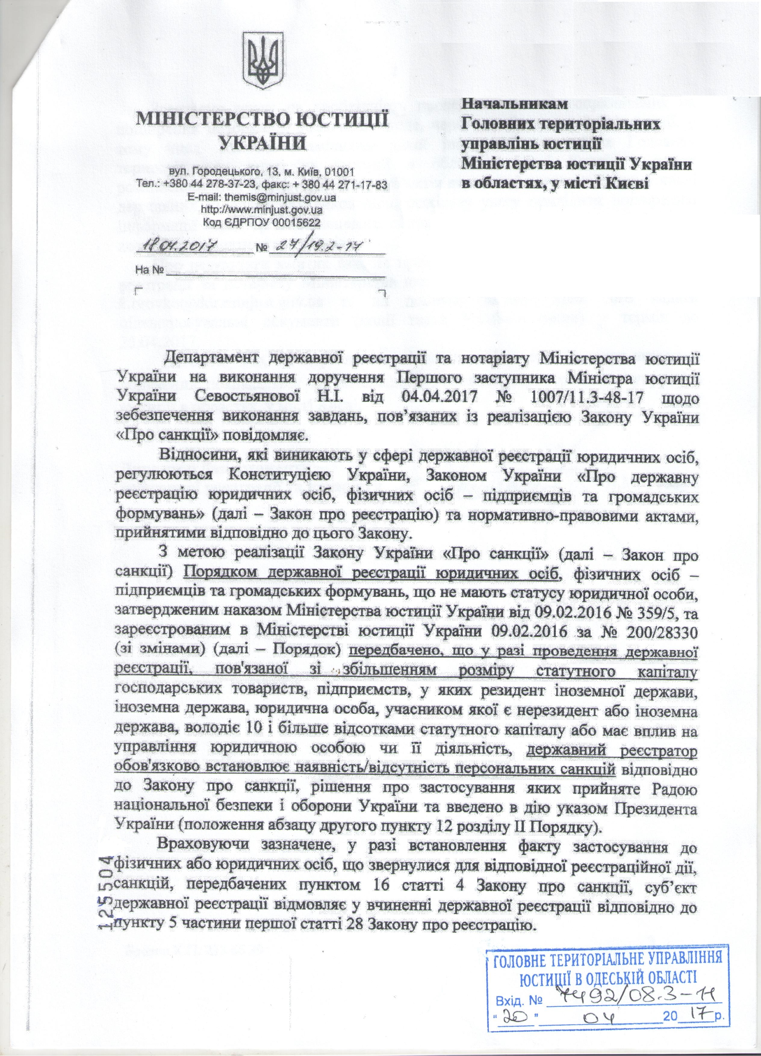 Лист Міністерства юстиції України від 18.04.2017 № 27/19.2-17 щодо обов’язкового встановлення наявності/відсутності персональних санкцій, передбачених Законом України «Про санкції», при державної реєстрації юридичних осіб