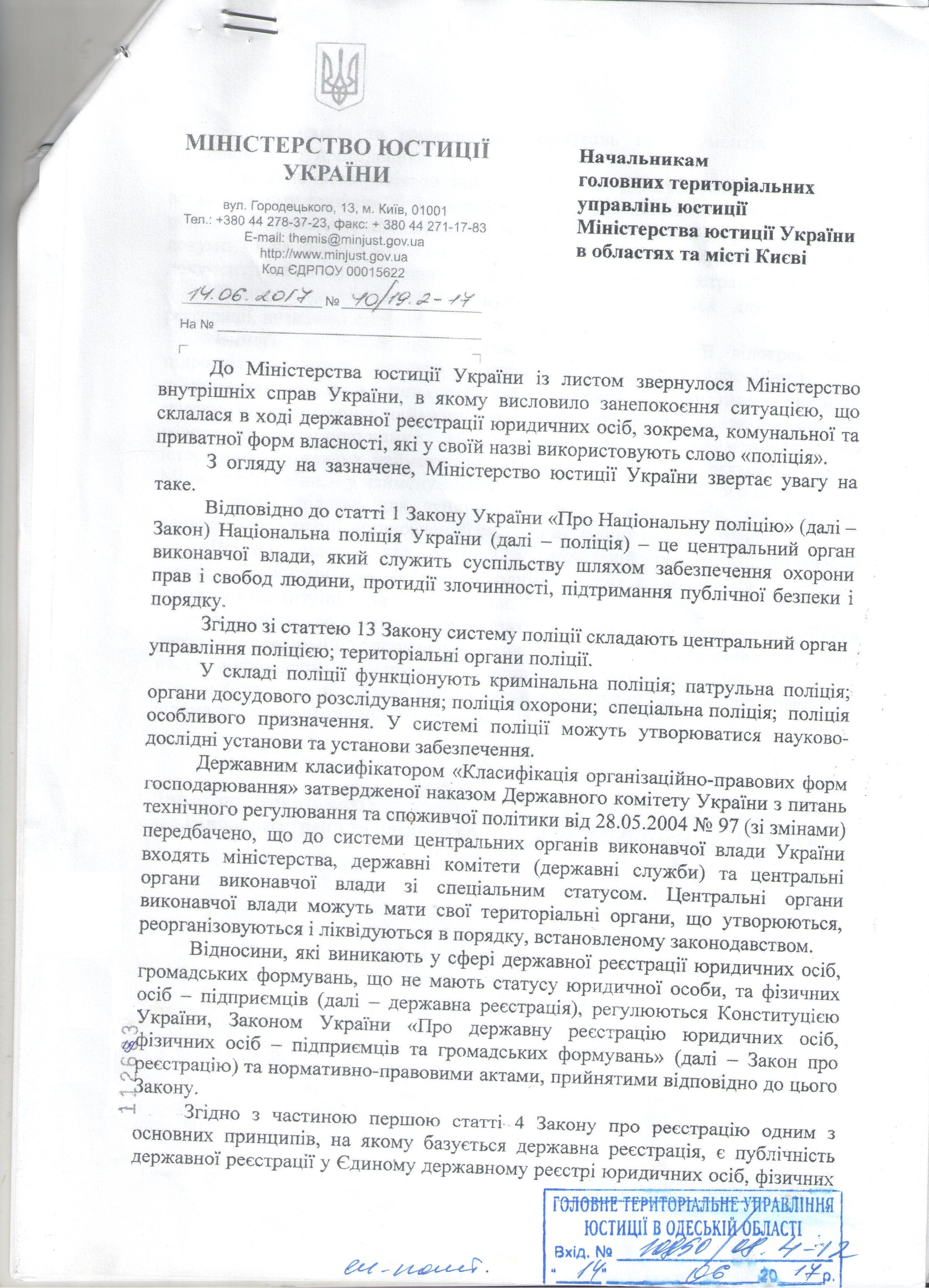 Лист Міністерства юстиції України від 14.06.2017 № 40/19.2-17 щодо використання слова «поліція» у найменуванні юридичних осіб при державній реєстрації