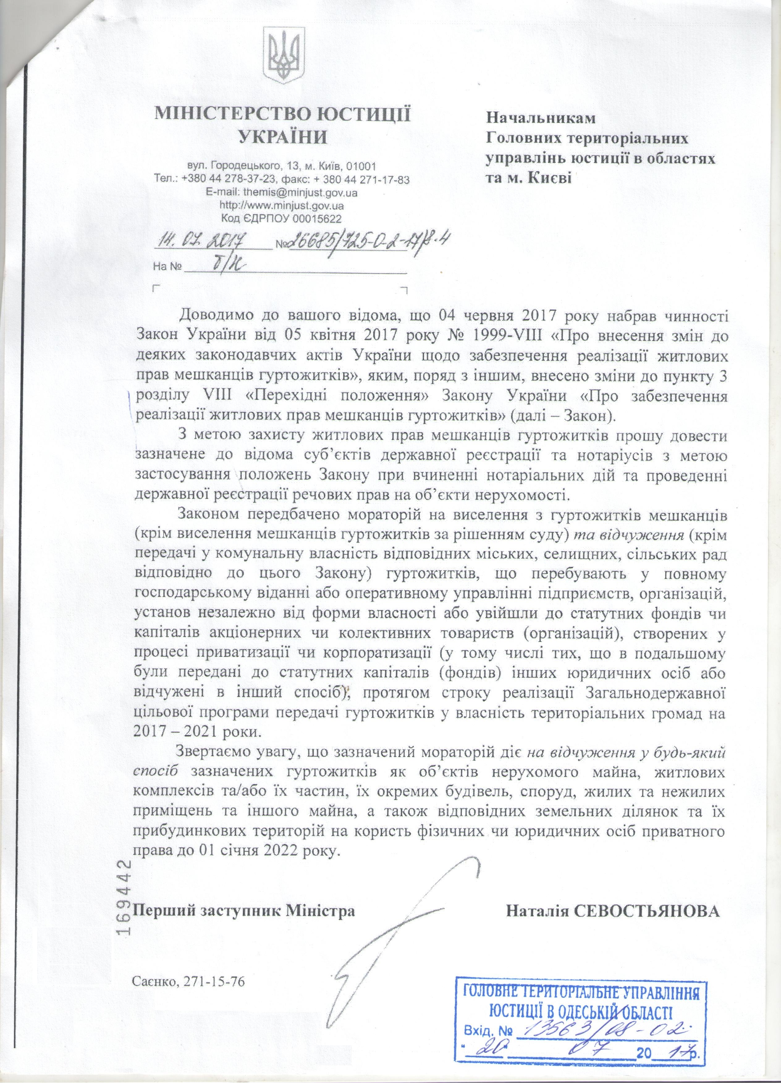 Лист Міністерства юстиції України від 14.07.2017 № 26685/725-0-2-17/8.4 щодо дії мораторію на виселення з гуртожитків та відчуження гуртожитків