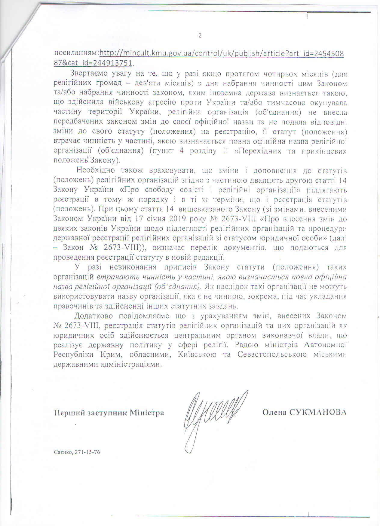 Лист Міністерства юстиції України щодо набрання чинності Закону України «Про внесення зміни до ст.12 Закону України «Про свободу совісті та релігійні організації